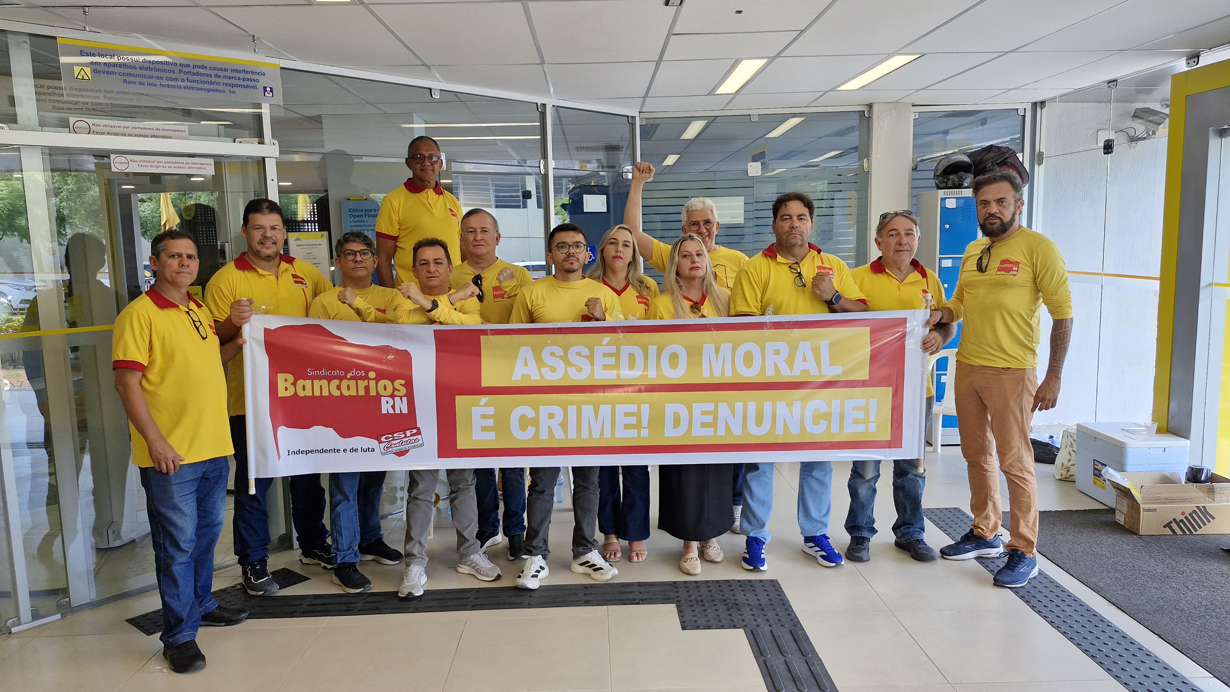 “Vamos realizar manifestações como essa em cada agência onde houver denúncias de assédio moral. Se precisar parar o dia todo, nós vamos parar. Assédio moral é crime e está adoecendo os trabalhadores”, afirmou Alexandre Cândido, coordenador do SEEB/RN.
