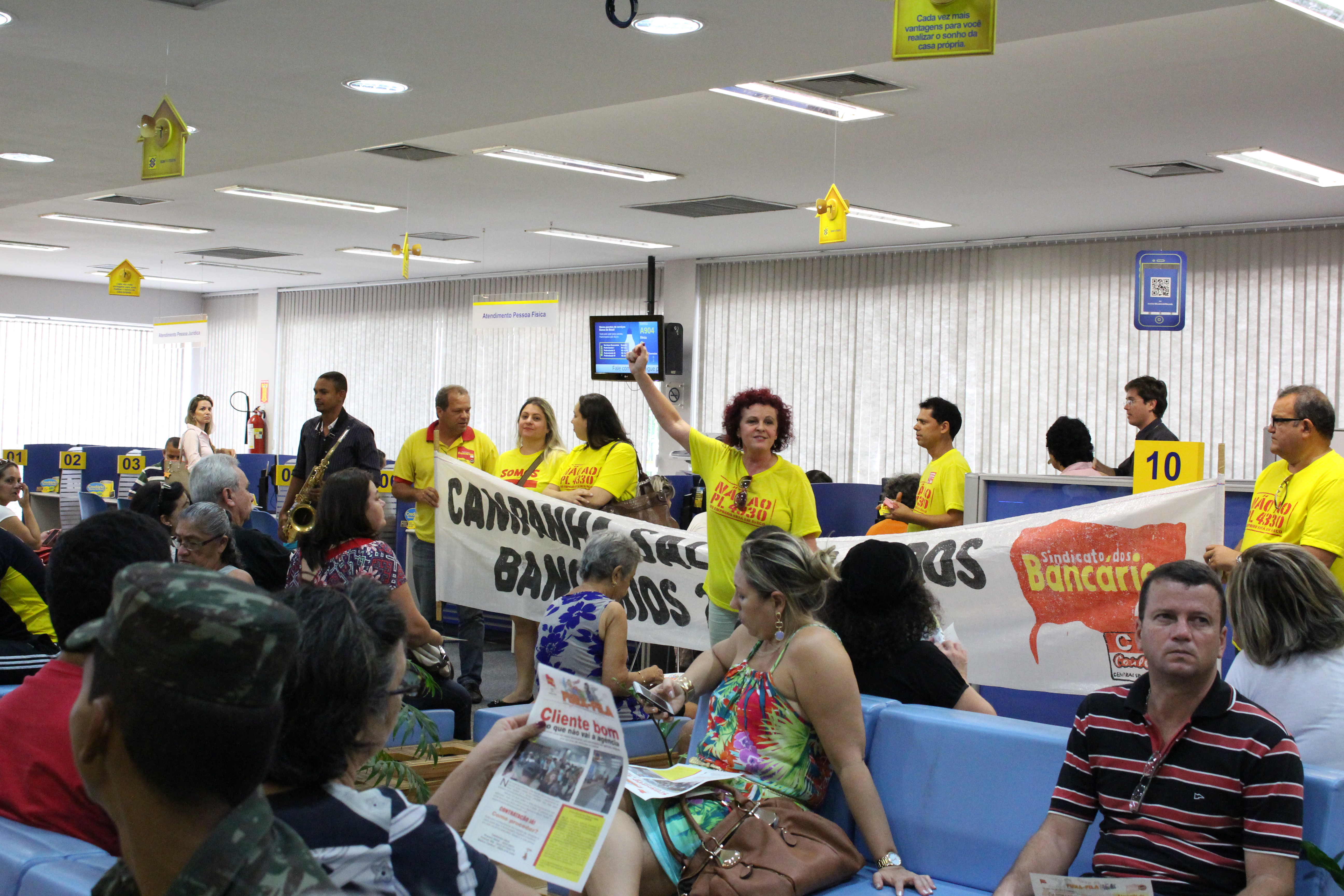 O Sindicato dos Bancários visitou várias agências nesta terça-feira convocando os bancários para a assembleia do dia 18 e explicando para os clientes os motivos da greve. Um saxofonista acompanha o discurso dos diretores.