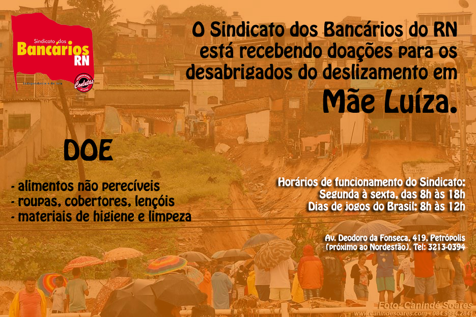 O Sindicato dos Bancários do RN também está recendo doações, pedindo que doem roupas, lençóis, materiais de limpeza, de higiene e alimentos não perecíveis.