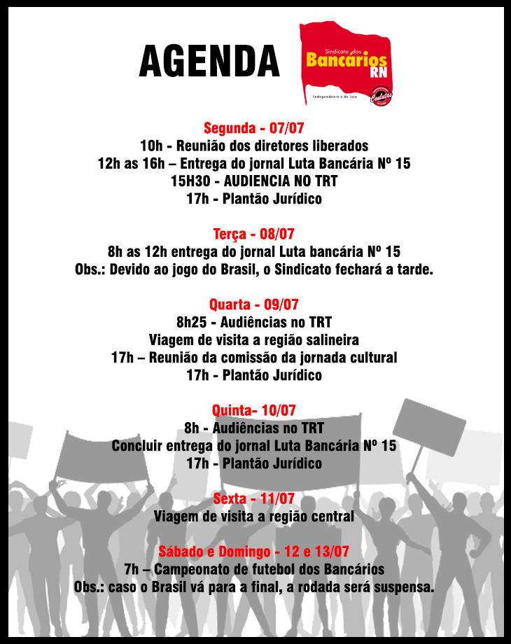 O Sindicato dos Bancários do RN irá divulgar, semanalmente, sua agenda de atividades. Assim você poderá ficar mais por dentro das atividades dos nossos diretores.