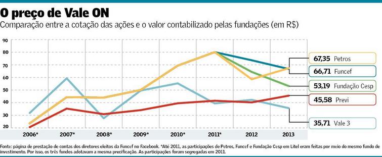 Uma comparação na avaliação de ativos comuns adotada pelos três maiores fundos de pensão de estatais do país - Previ (Banco do Brasil), Petros (Petrobras) e Funcef (Caixa Econômica Federal) - mostra que o preço atribuído por Funcef e Petros para a participação que detêm no bloco de controle da Vale foi inflado nos últimos anos. Em média, os preços contabilizados pelos fundos da Caixa e da Petrobras entre 2006 e 2013 foram 50% maiores que os da Previ, que também faz parte do bloco de controle.