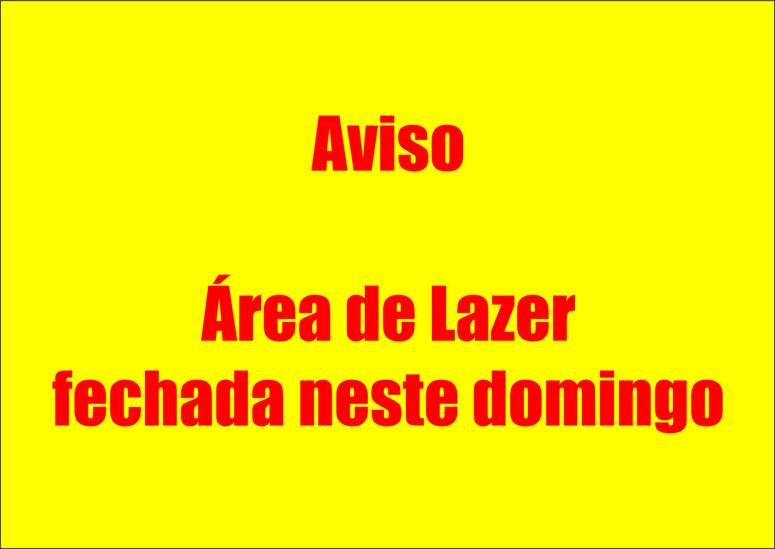 Informamos aos usuários da Área de Lazer que não haverá funcionamento neste domingo, 13 de setembro, pois o local estará em manutenção. Pedimos a compreensão de todos.
