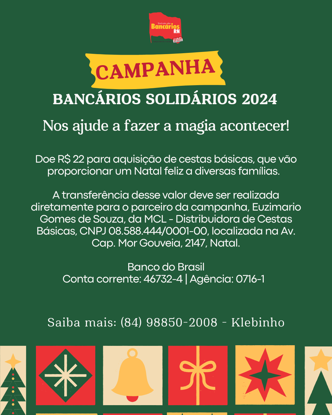 O Sindicato dos Bancários, por meio do bancário aposentado, Klebinho, convida a todos para se unirem à Campanha Bancários Solidários 2024. O propósito dessa iniciativa é transformar sua doação de R$ 22 na aquisição de cestas básicas, proporcionando um Natal feliz a diversas famílias.